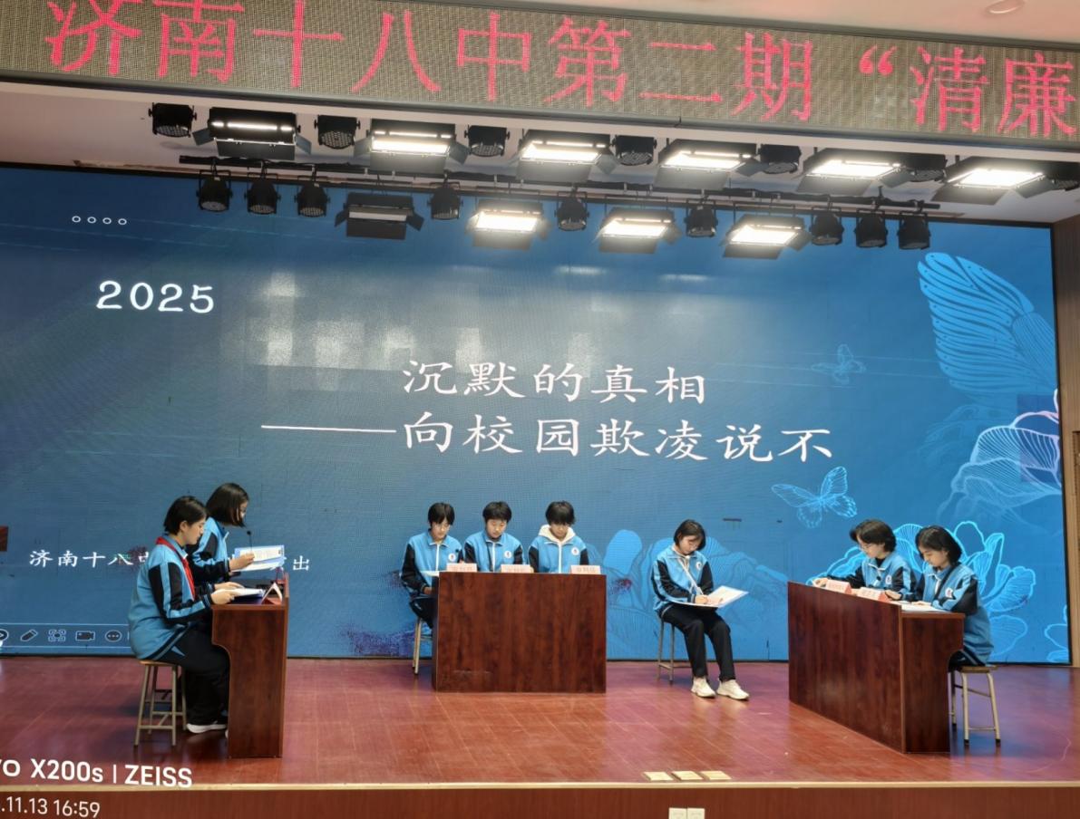 清风沐校园,廉洁润心田 ——济南十八中第二期“清廉剧场”圆满落幕 11月13日下午,济南十八中养正楼五楼多功能厅内掌声阵阵,第二期“清廉剧场”展演活动在此隆重举行。本次活动由学校党总支统筹策划,语文、历史、道德与法治教研组联合指导,初一初二学生自编自演,给全体师生呈现了一堂别开生面的廉洁教育课。