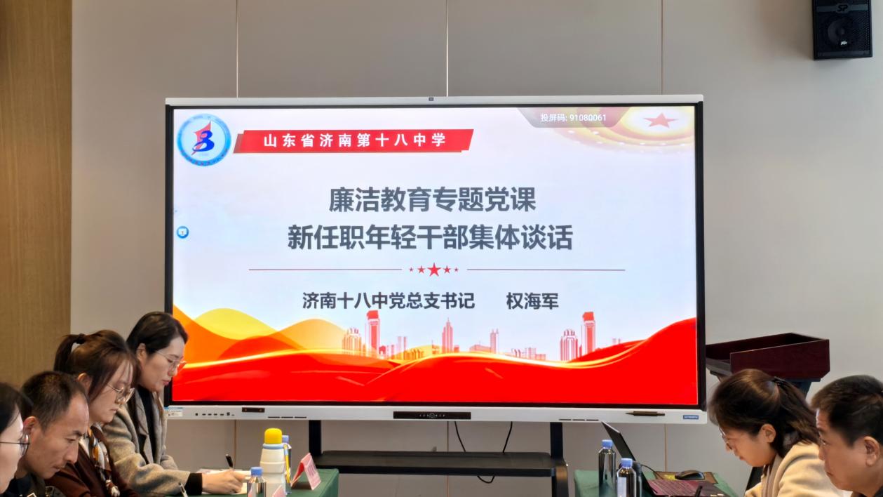 筑牢思想根基 严守纪律底线 ——济南十八中开展廉洁教育专题党课暨新任职干部集体谈话 为加强干部队伍建设,提升新任干部的政治素养和履职能力,2025年11月22日,济南十八中举办廉洁教育专题党课暨新任职年轻干部集体谈话。会议由校长吕福昌主持,学校党总支书记权海军围绕“什么是好干部”“如何成为好干部”为主题担任主讲,结合教育系统实际,为全体中层以上干部成长指明方向、划清底线。