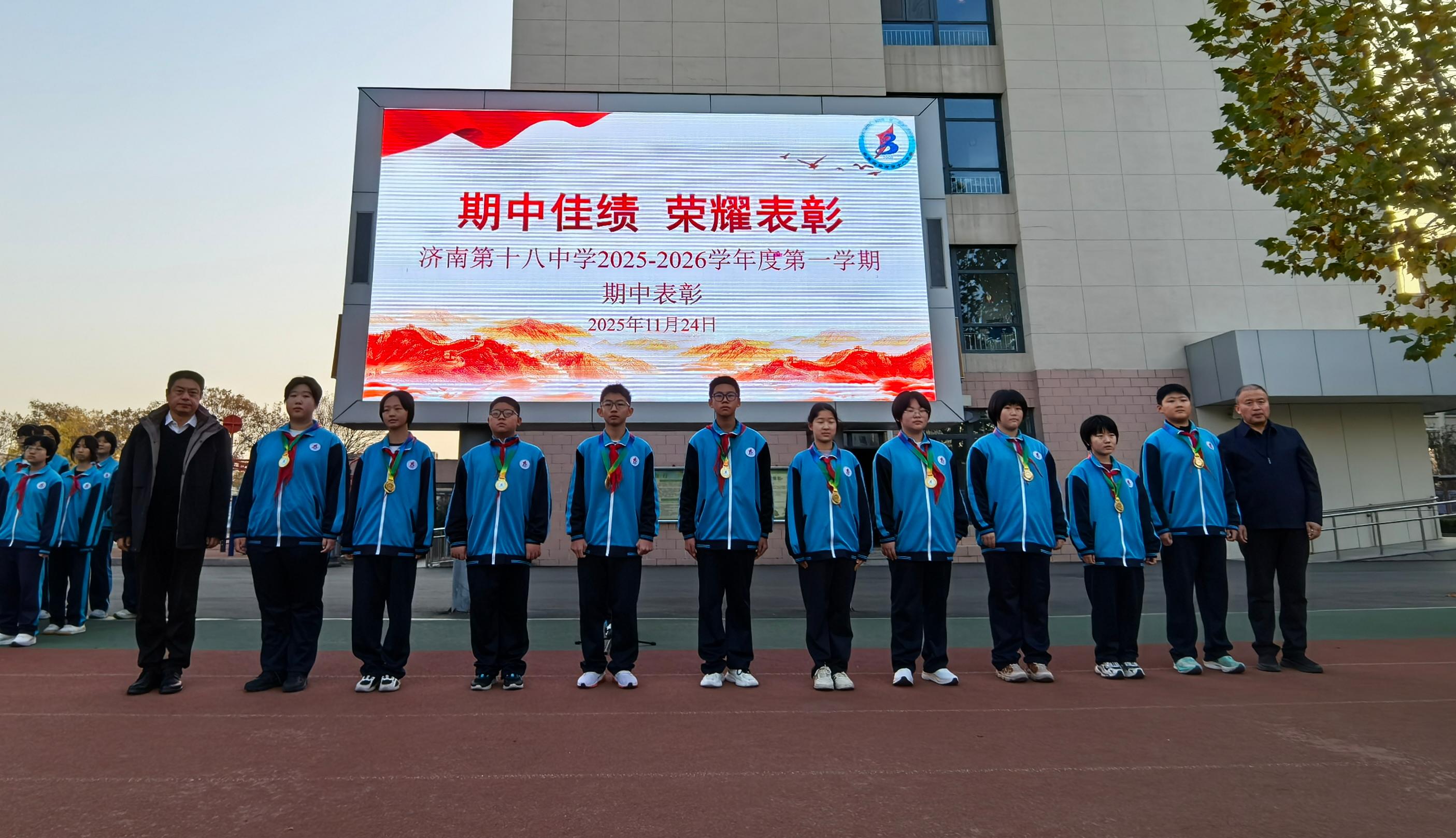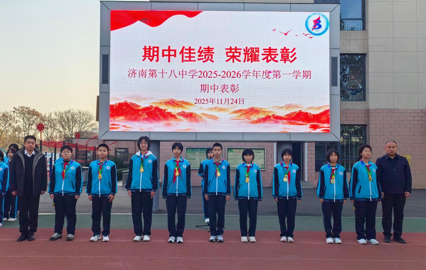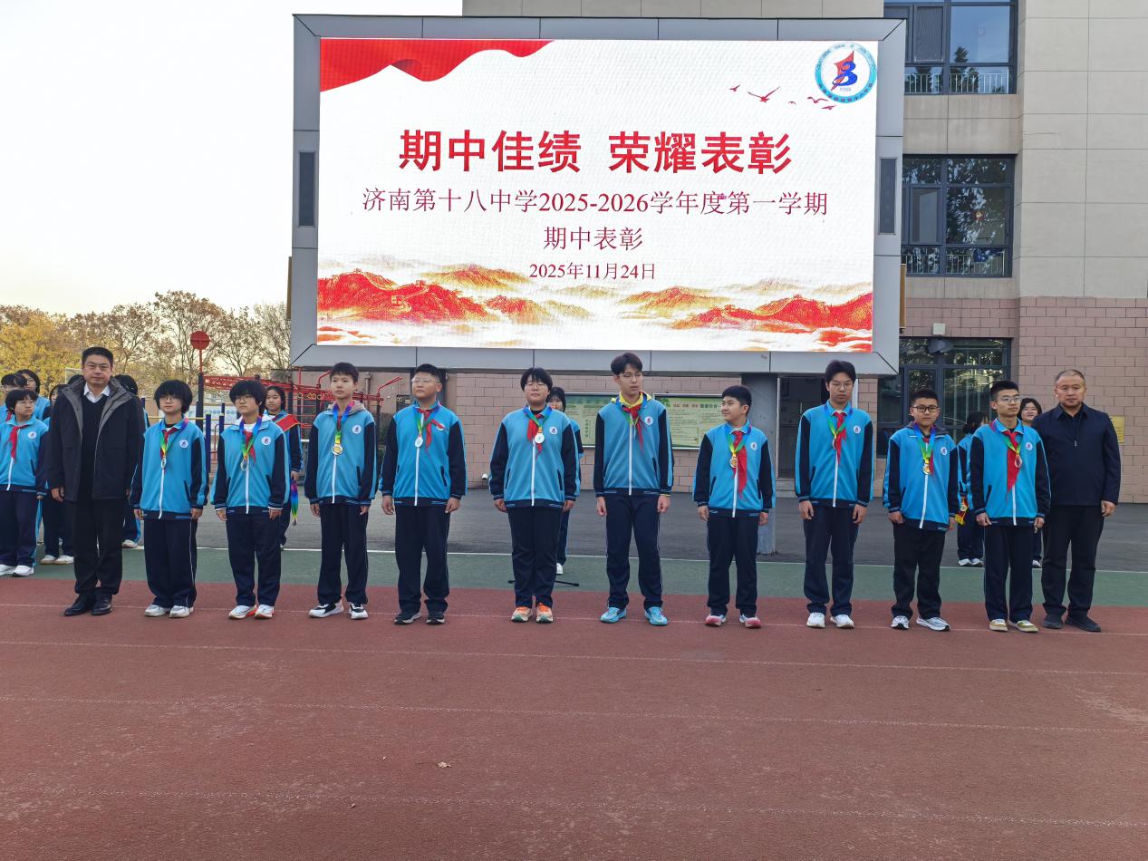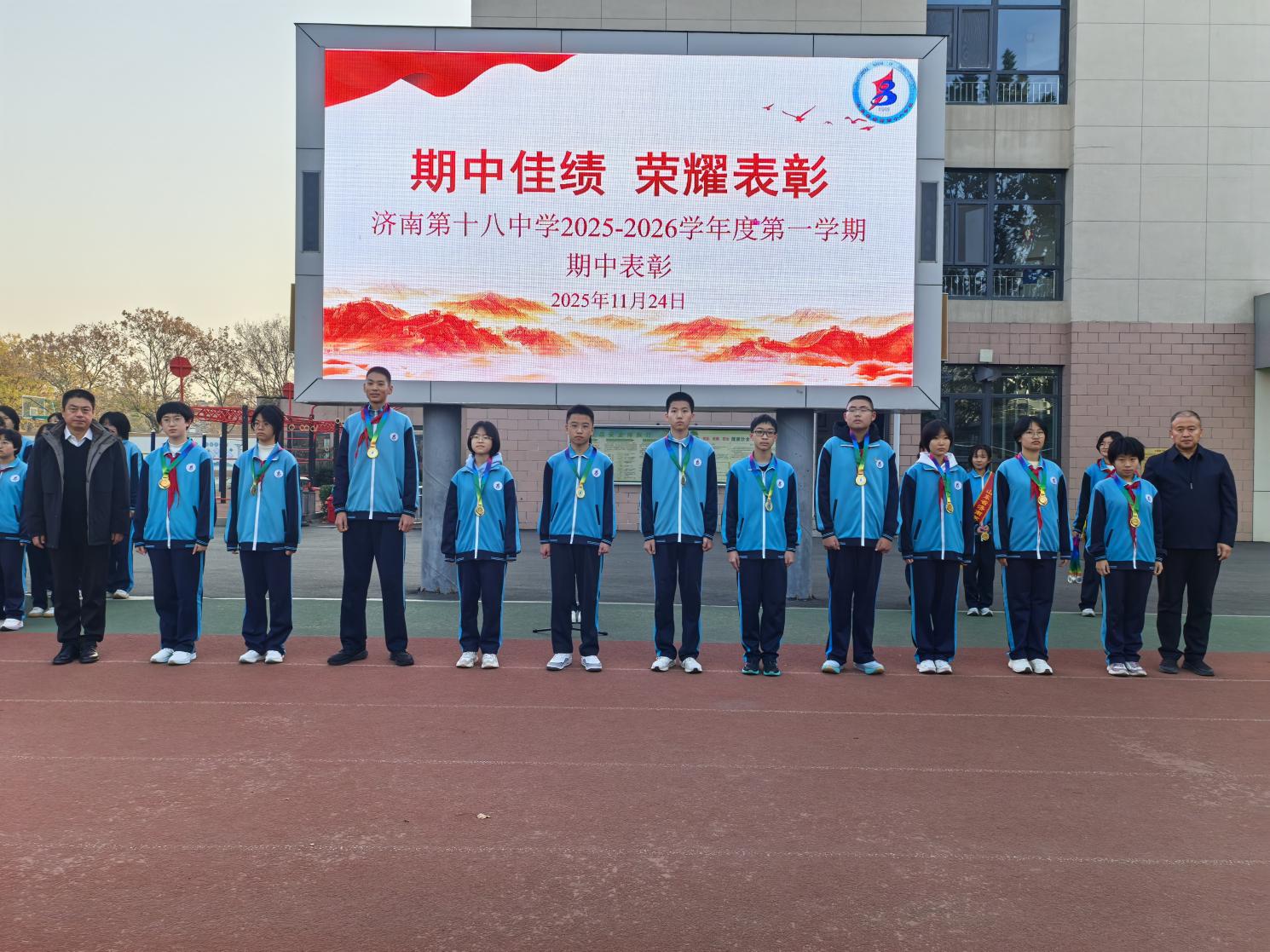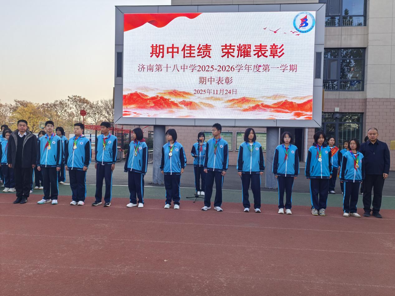 表彰先进树榜样,笃行致远启新程 —— 山东省济南第十八中学2025—2026 学年第一学期期中考试表彰大会顺利举行 11月24日上午,山东省济南第十八中学全体师生齐聚操场,隆重举行2025—2026学年第一学期期中考试总结表彰大会。本次大会旨在树立学习典范,表彰在本次考试中表现优异的同学,进一步激发全体学生积极向上、奋发进取的学习热情。