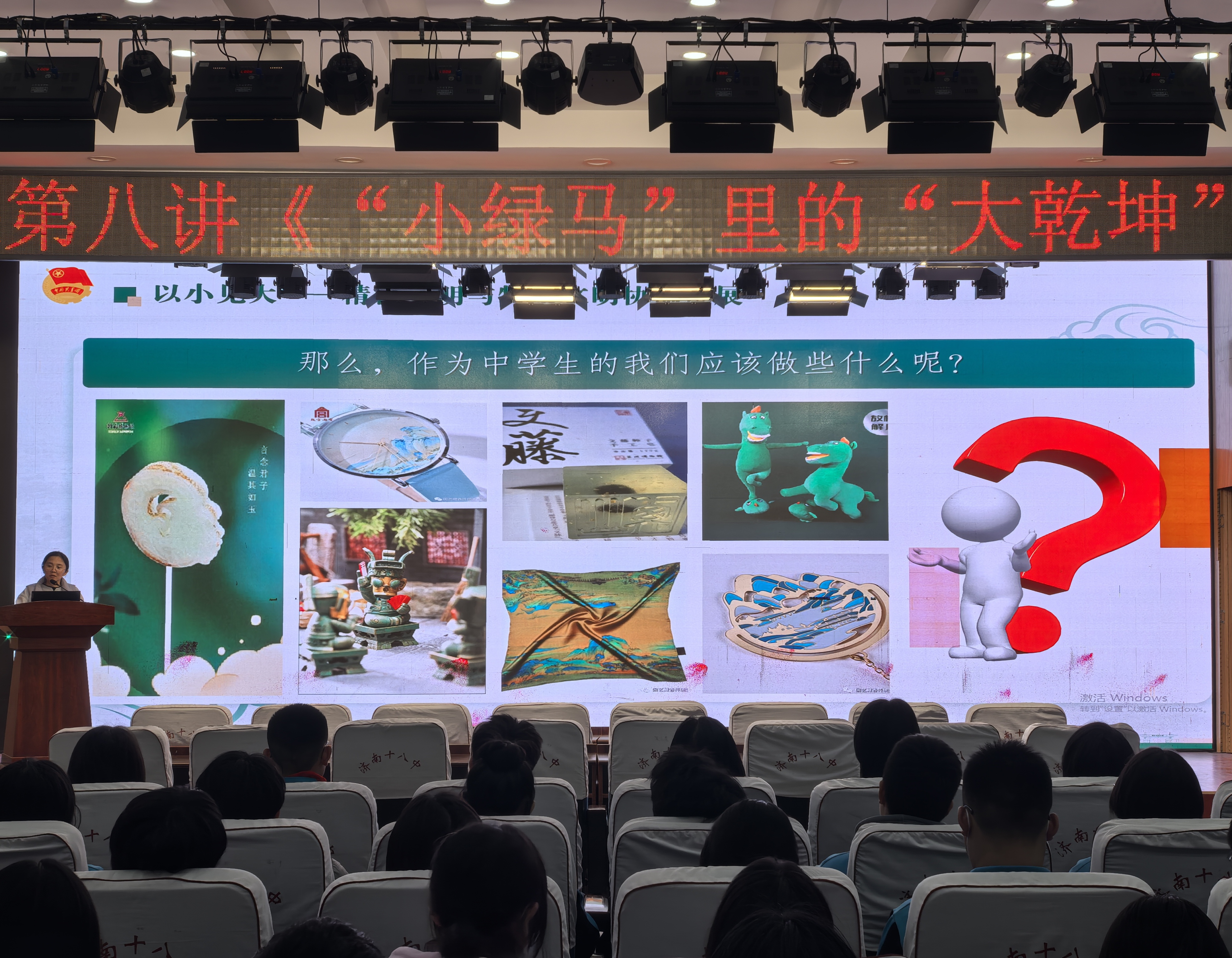 继探寻“时代之光”的精神引领后,济南十八中“少年先锋团校”系列课程的目光投向文明传承的现代活力与青春表达。2025年12月10日下午,第八讲《“小绿马”里的“大乾坤”》在养正楼多功能厅开讲。本次课程由张娜娜老师主讲,以风靡全国的甘肃省博物馆文创玩偶“小绿马”为生动切入点,带领2023级及2024级入团积极分子,解码一件“爆款”文创背后物质文明与精神文明协调发展的深刻逻辑,感受中华优秀传统文化在当代的创造性转化与创新性发展。