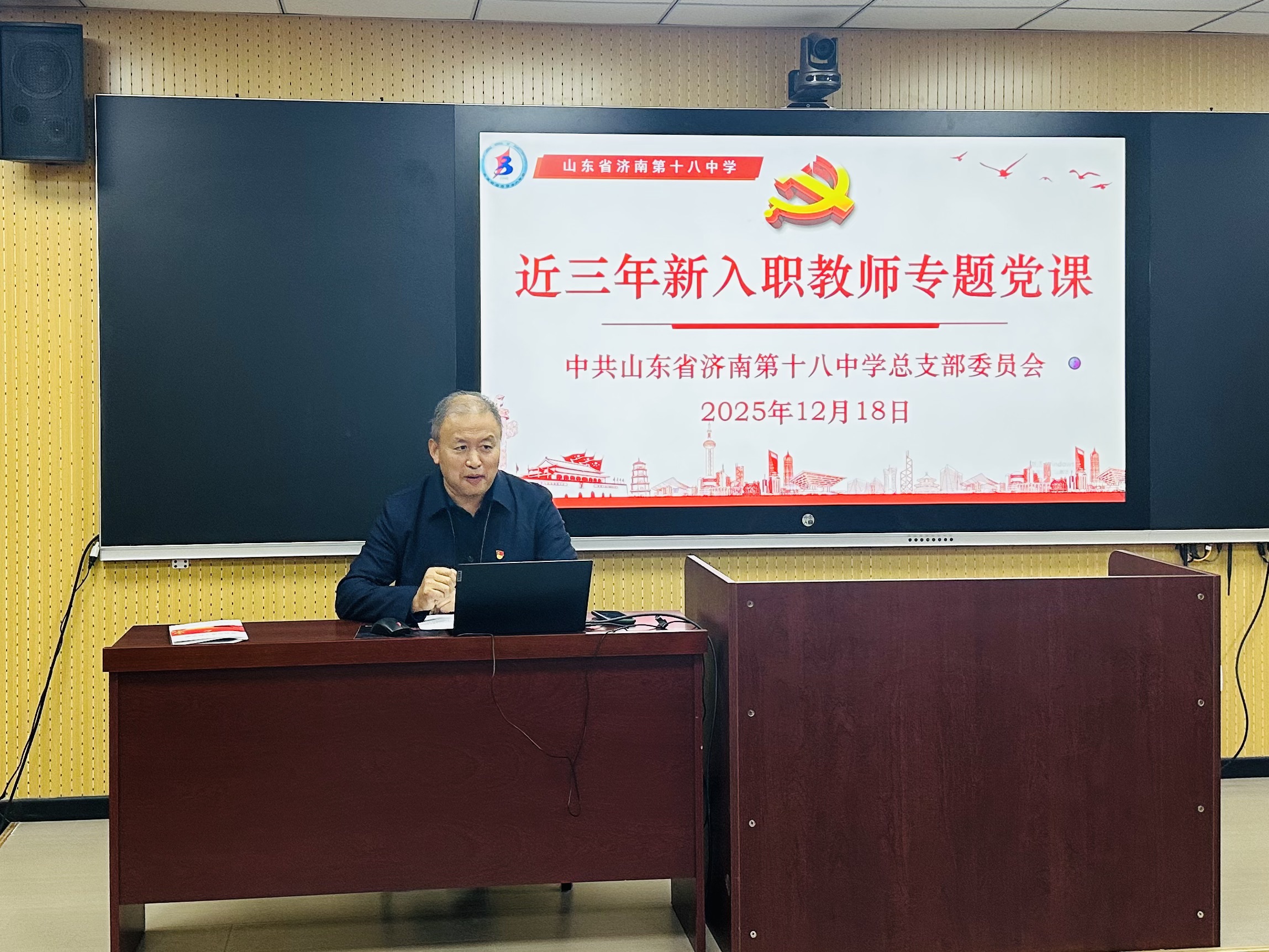 弘扬伟大建党精神,筑牢立德树人根基 ——济南十八中举办新教师专题党课 为加强对近三年新入职教师的思想政治引领,2025年12月18日,济南十八中组织开展了以“弘扬伟大建党精神”为主题的专题党课活动。活动通过理论解读、案例分享与谈心交流相结合的方式,引导新教师深刻理解建党精神的内涵与时代价值。