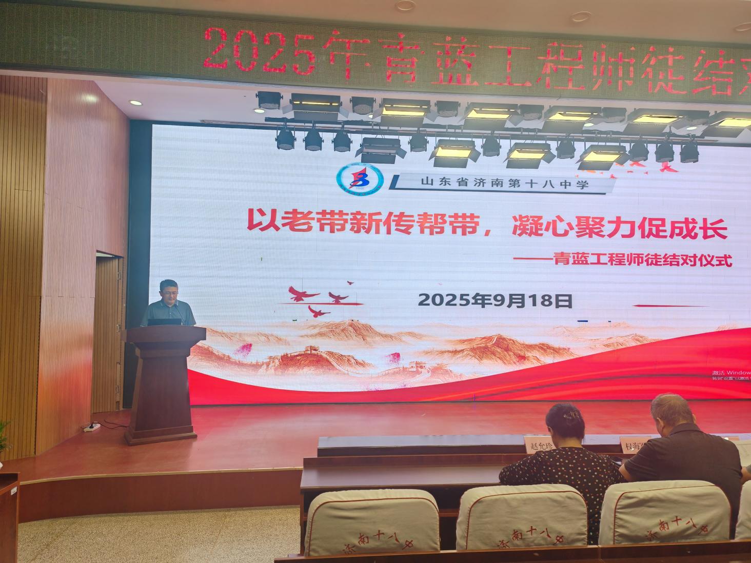 青蓝相映传薪火 师徒携手育桃李 ——济南十八中隆重举行“青蓝工程”师徒结对仪式 为加强教师队伍建设,充分发挥骨干教师的“传、帮、带”作用,助力青年教师快速成长,2025年9月18日下午,济南十八中在报告厅隆重举行了主题为“以老带新传帮带,凝心聚力促成长”的“青蓝工程”师徒结对仪式。