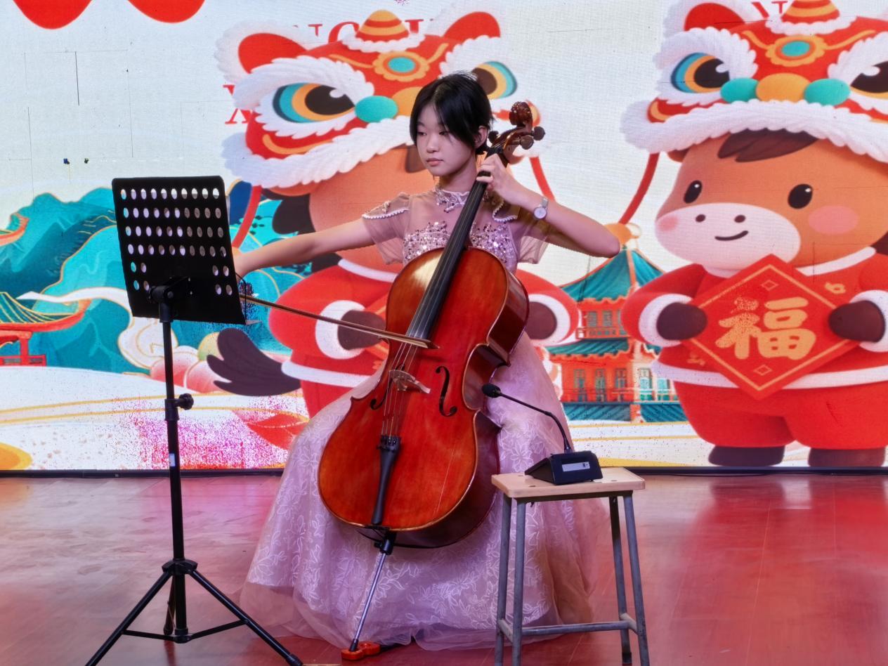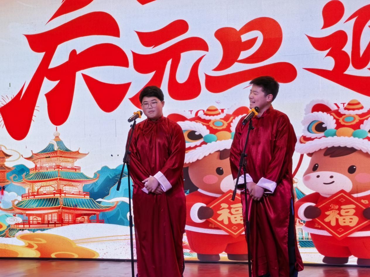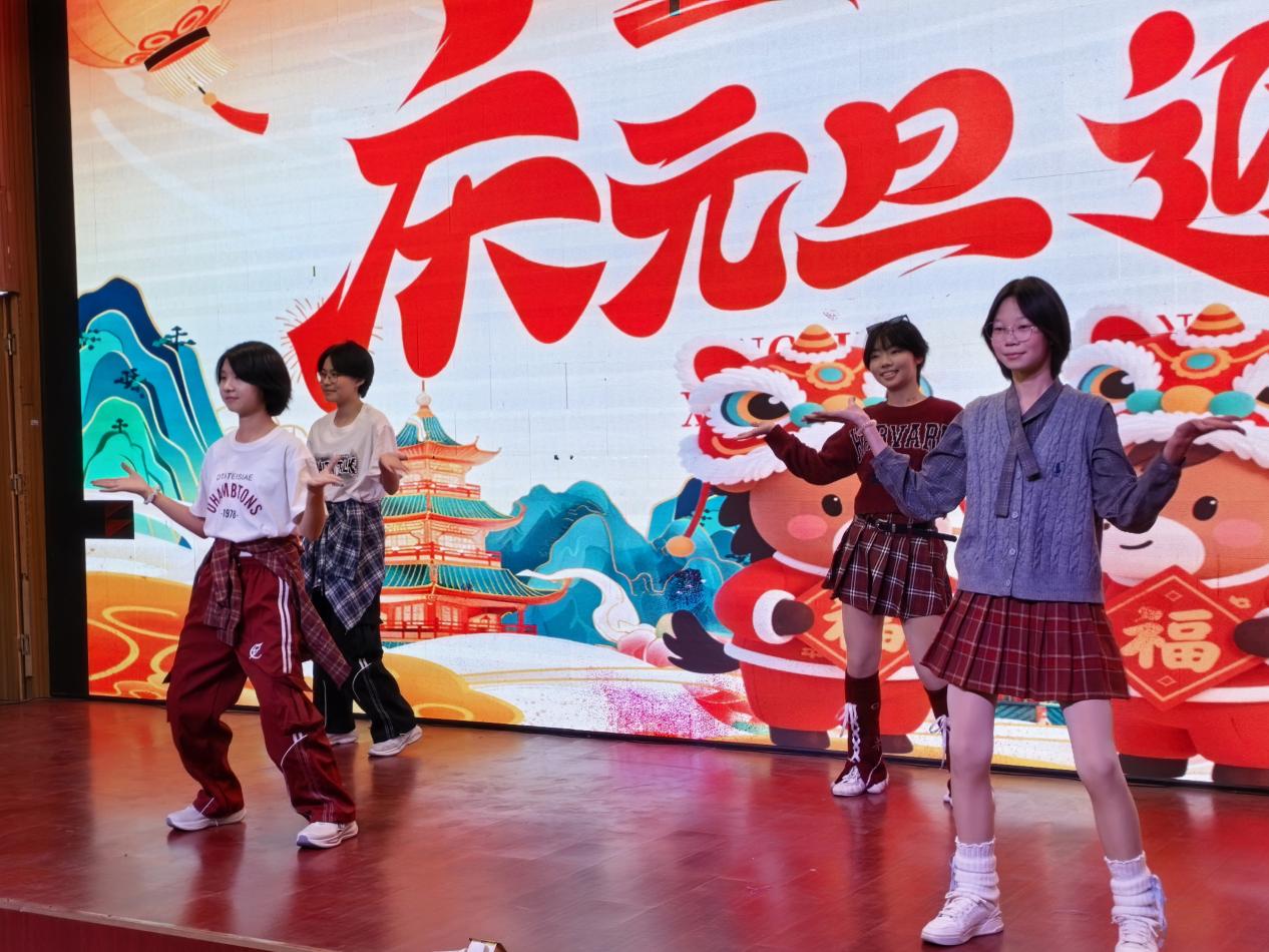 学校校长吕福昌发表新年贺词,回顾2025年学校取得的优异成绩,向全校师生致以诚挚问候与祝福,同时鼓励大家在新的一年继续奋进,共创更辉煌的明天。 元旦文艺展演作为系列活动的重头戏,节目类型丰富多样:既有展现童真与想象的合唱、舞蹈,也有表达青春梦想与担当的相声、小品。有的以清澈歌声与灵动舞步传递新年喜悦与期待;有的则更显成熟自信,同学们用深情演唱与有力舞蹈诉说青春故事与追求。 其中,初二八班房瑜玲、杜迎秋同学的开场歌曲《花开无忧》,以清甜嗓音拉开演出序幕;初二五班周国锦等同学的舞蹈《青花瓷》,以曼妙舞姿勾勒古典美学意境;初一二班孔澳宸同学演唱的《乌兰巴托的夜》,带领观众领略草原的辽阔与宁静。此外,古筝演奏《青花瓷》、拉丁舞《风暴》、相声《勤俭之星》等节目各具特色,赢得观众热烈掌声。