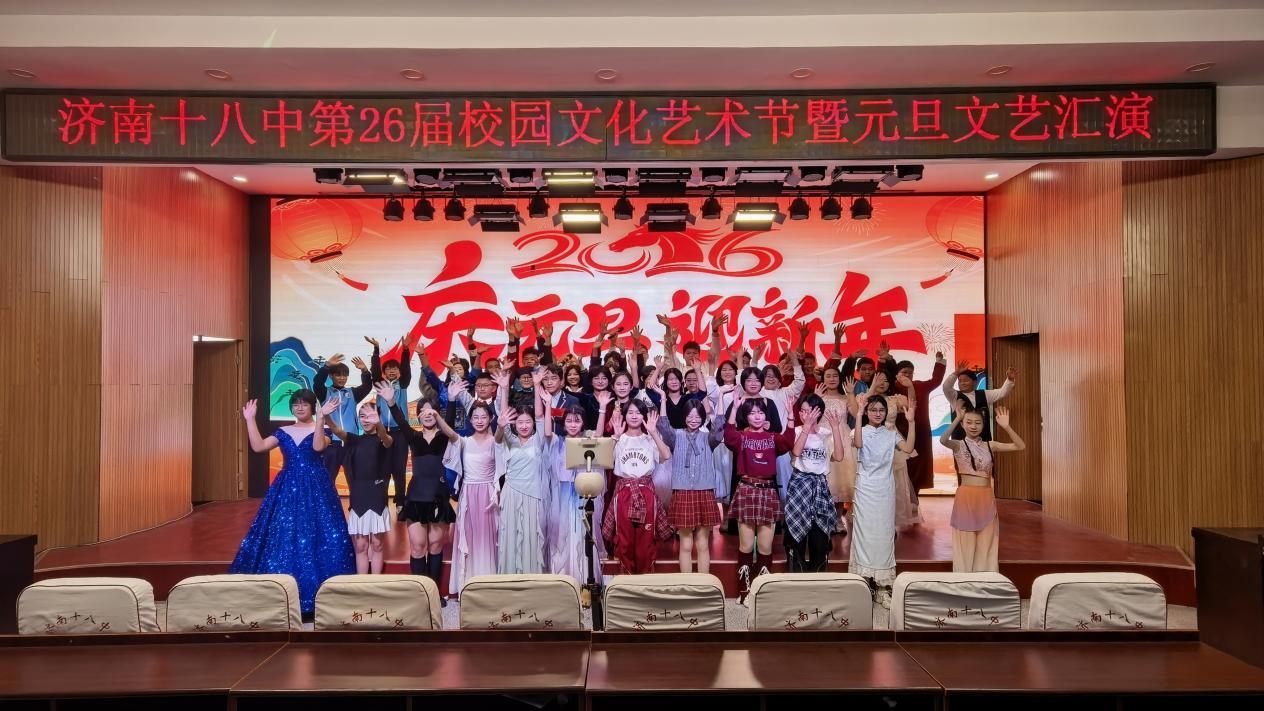 “马踏新程,筑梦扬帆” —济南十八中成功举办第二十六届校园文化艺术节 为庆祝2026年元旦到来,感受新年新气象,展示济南十八中育人成果,发挥学生艺术特长,为孩子们搭建展示自我的舞台,分享成长中的努力与欢乐,济南十八中于2025年12月31日下午隆重举办第二十六届校园文化艺术节暨“庆元旦·迎新年”文艺汇演,1300余名师生及家长共同畅享这场文化与艺术的盛宴。 元旦前夕,各班级围绕“新岁愿望、文明校园、感恩成长”等主题,开展丰富多彩的迎新活动:有的组织“新年目标制定会”,引导学生将美好愿望转化为具体行动;有的制作“感恩卡片与祝福墙”,传递对师长、同伴的深情厚谊。此外,各班还将劳动教育融入迎新布置,学生们亲手装饰教室,营造温馨浓郁的节日氛围,增强集体荣誉感与责任感。这些贴近学生生活的活动,让元旦不再是“热闹的一天”,而成为一次有温度、有目标、有收获的成长实践。