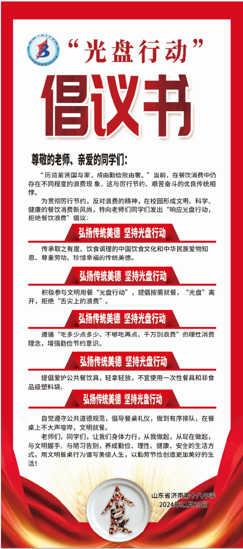 济南十八中开展的“文明就餐·光盘行动”主题教育系列活动,不仅是一次生动的德育实践,更是一次对中华民族传统美德的传承和弘扬。学校将以此次活动为契机,持续深化勤俭教育,把节约粮食理念融入日常教育教学中,通过开展形式多样的活动,让节约在校园内成为一种习惯、一种品行。同时,学校还将进一步加强与家庭、社会的联系,形成教育合力,共同培养担当民族复兴大任的时代新人,为构建节约型社会贡献力量。