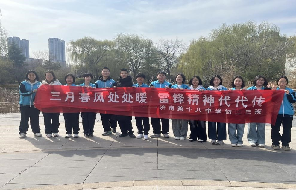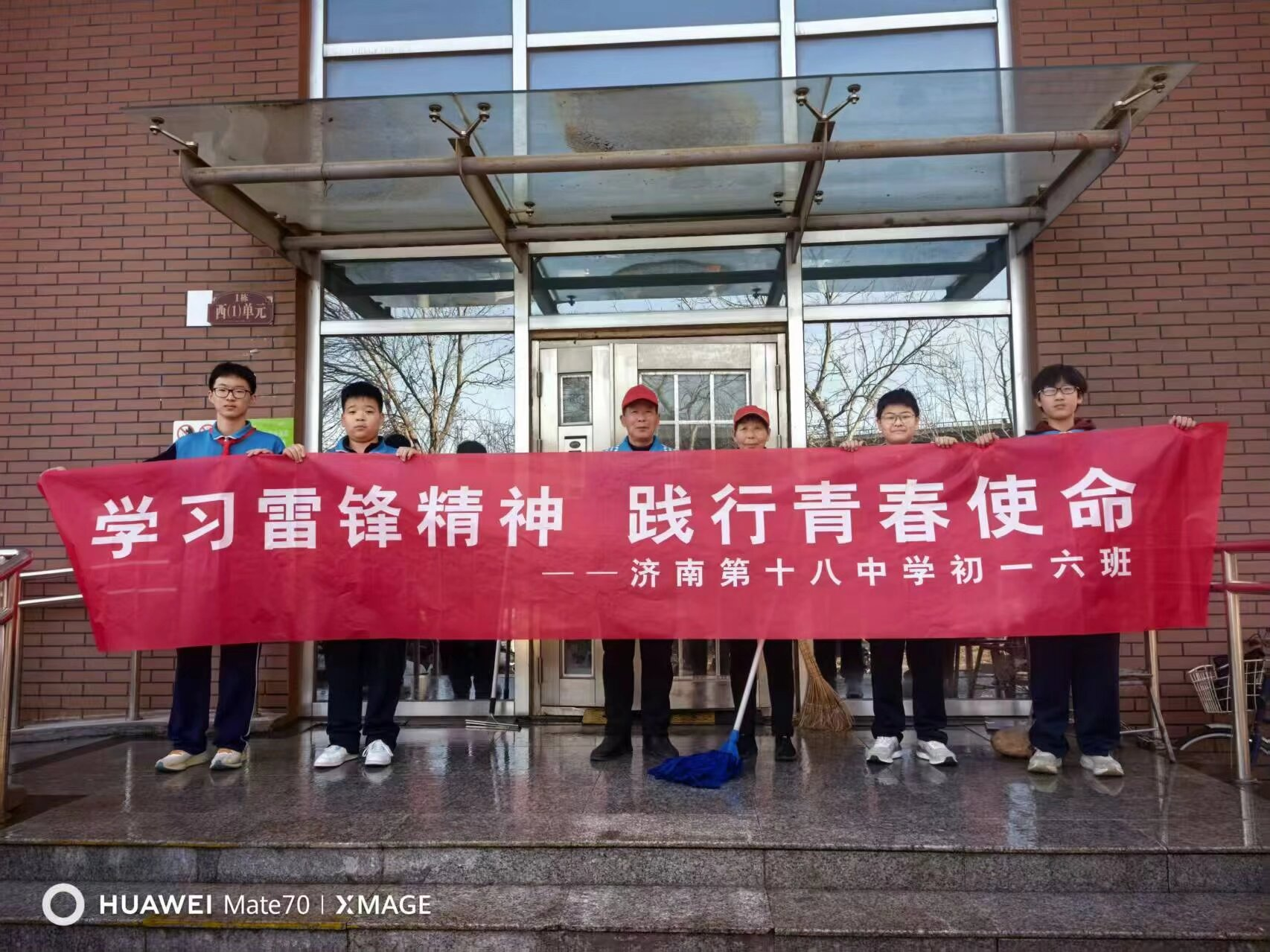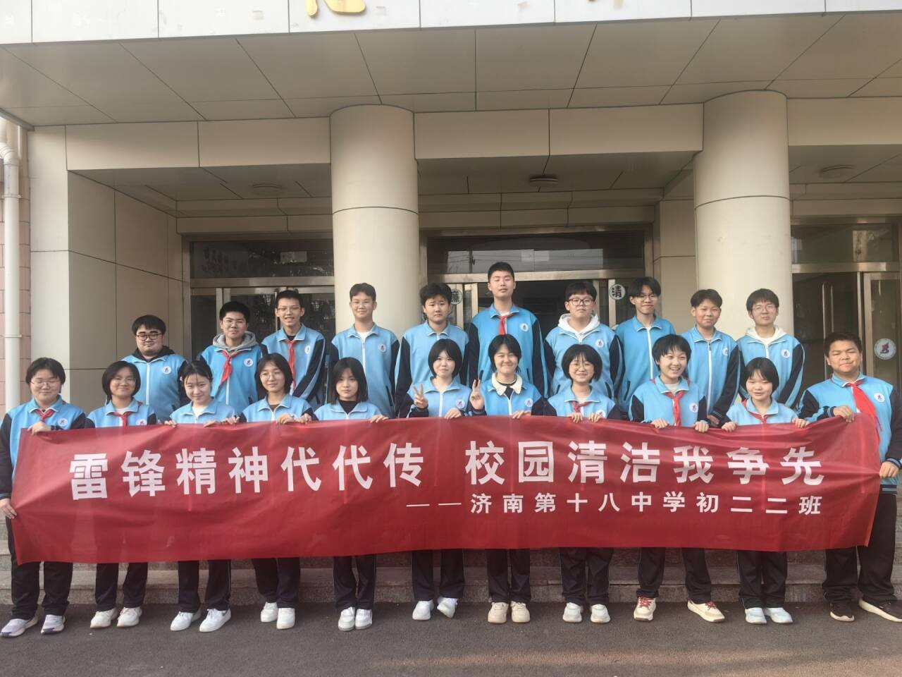 春风三月暖 追“锋”正当时 ——济南十八中学雷锋志愿服务活动月纪实 三月春风处处暖,雷锋精神代代传。济南十八中将三月定为学雷锋志愿服务活动月,全校各班级积极响应,走出教室、走进校园、深入社区,用行动书写新时代的雷锋故事。 篇章一:净美校园·始于足下 初二(1)中队、初二(2)中队从身边小事做起,用双手为校园“梳妆打扮”。同学们拿起抹布擦亮教室角落,握着扫帚清扫路面落叶,俯身钻进树丛捡拾垃圾。从教学楼到绿化带,从教室到办公室,大家还主动为老师清洁办公环境,用细致劳动表达感恩之情。