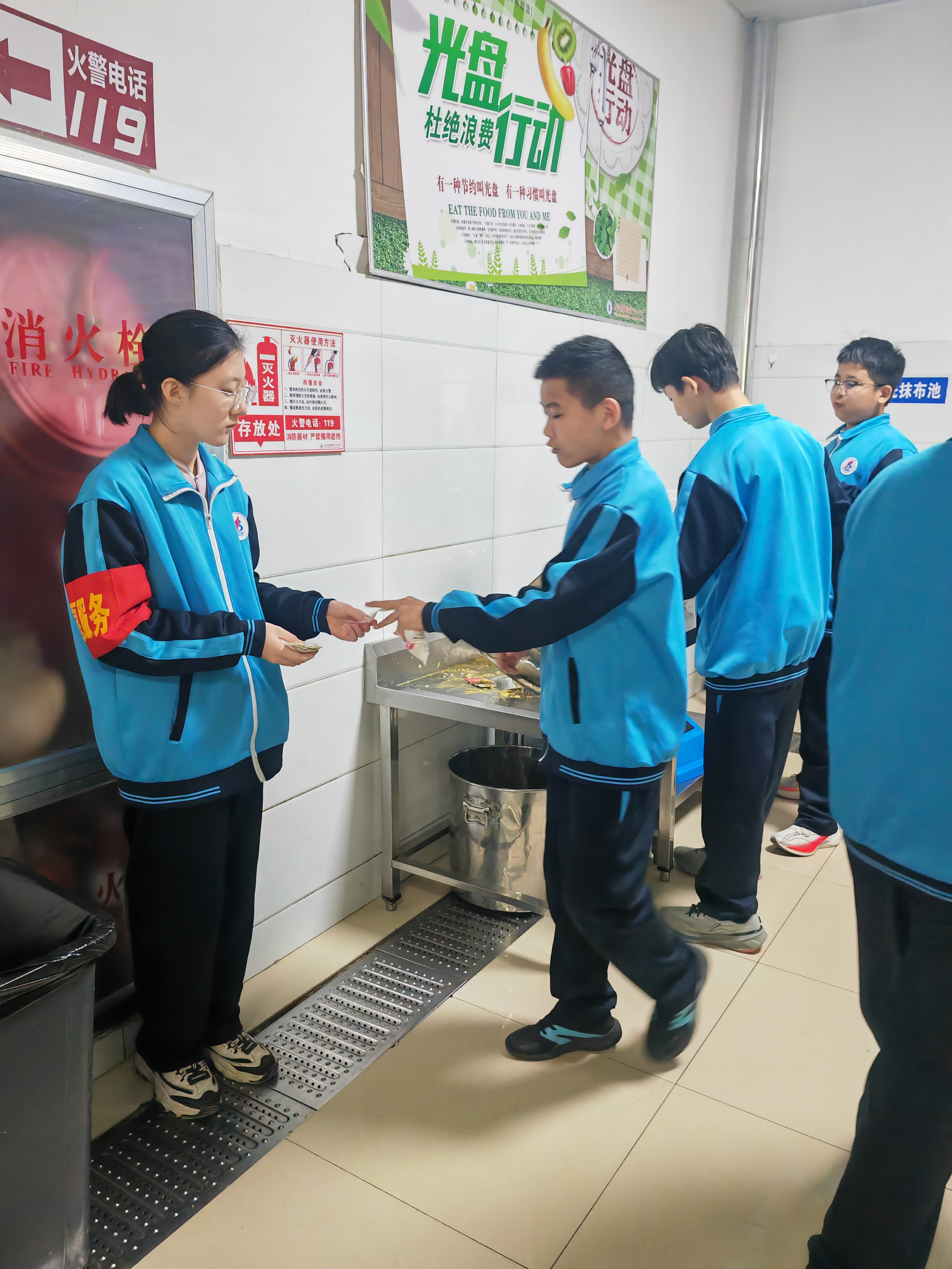 篇章四:微光成炬·小岗大责 各个中队的志愿者们在午餐时段到食堂执勤,维持秩序、提醒“光盘行动”、收拾餐桌。一句“请排队”,一声“请节约粮食”,让文明就餐成为校园新风尚。