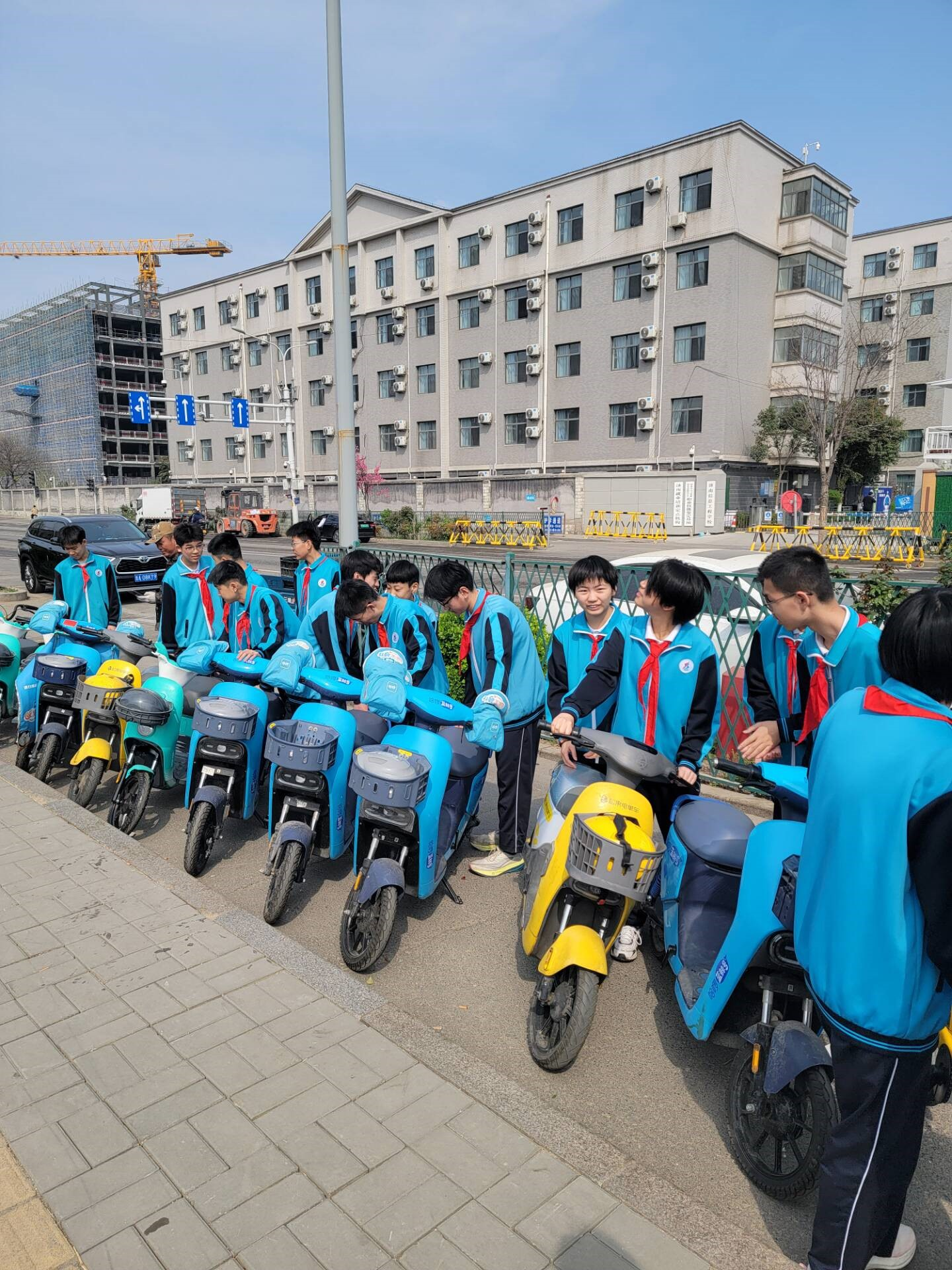 初二(5)中队来到地铁口,扶起倒伏的电动车、共享单车,清理周边烟头塑料瓶,过往市民纷纷点赞。
