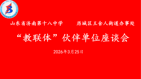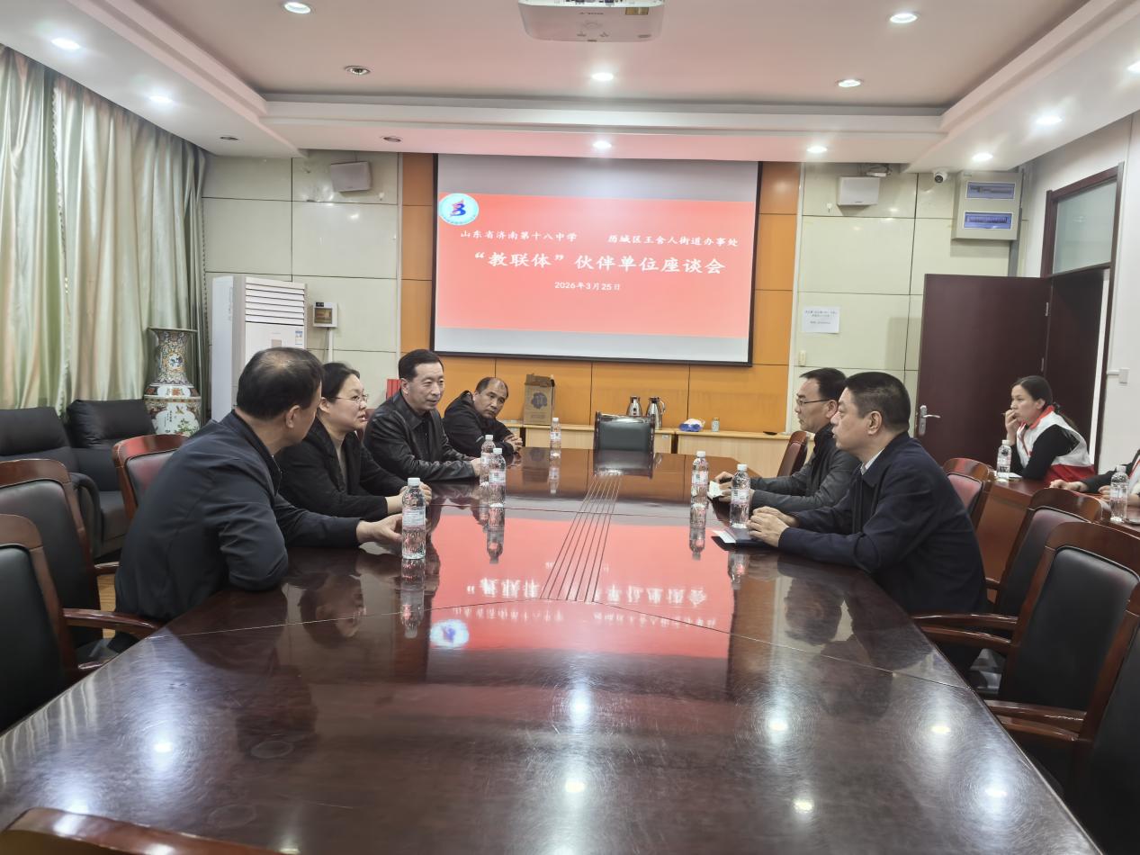 2026年3月25日,济南十八中携手王舍人街道办事处、万象东方社区,联合举办“教联体”伙伴单位座谈会。各方代表齐聚一堂,共商校家社协同育人新路径,推动“教联体”建设走深走实。济南十八中吕校长、蔡校长,历城区红十字会副会长张英华,王舍人街道党工委副书记李刚,街道社会事务科科长、红十字会秘书长温兴同,以及历城区红十字会志愿服务队代表原阔等参加座谈会。