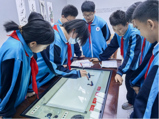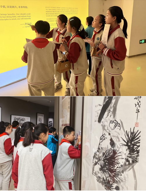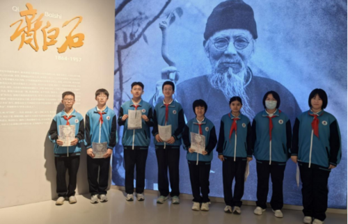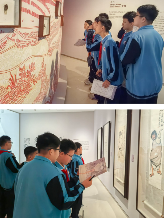 观展过程中,同学们手持研学任务卡,循着“古今可师”“我行我道”“白石门下”三大单元的齐派艺术传承脉络,一边近距离观赏灵动逼真的墨虾、憨态可掬的螃蟹等齐白石经典之作,一边对照任务卡提示认真答题、细致记录,不时驻足凝视、交流探讨。教师们结合齐白石“学我者生,似我者死”的艺术箴言,用通俗语言讲解作品创作背景、艺术手法与文化内涵,解读齐派艺术与齐鲁文化的深厚联结,让学子们感受大师的艺术情怀与创作智慧。