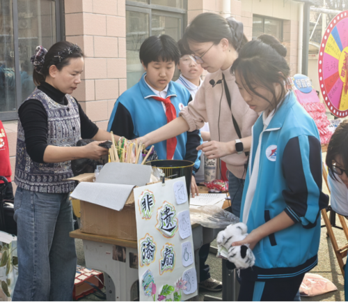漆扇摊位,班主任亲自上阵 漆扇摊位前,更是排起了长龙。班主任亲自上手,一边讲解制作工艺,一边帮助同学们挑选心仪的扇面。精致的漆扇很快被抢购一空,不少同学直呼“太值了,舍不得用”。