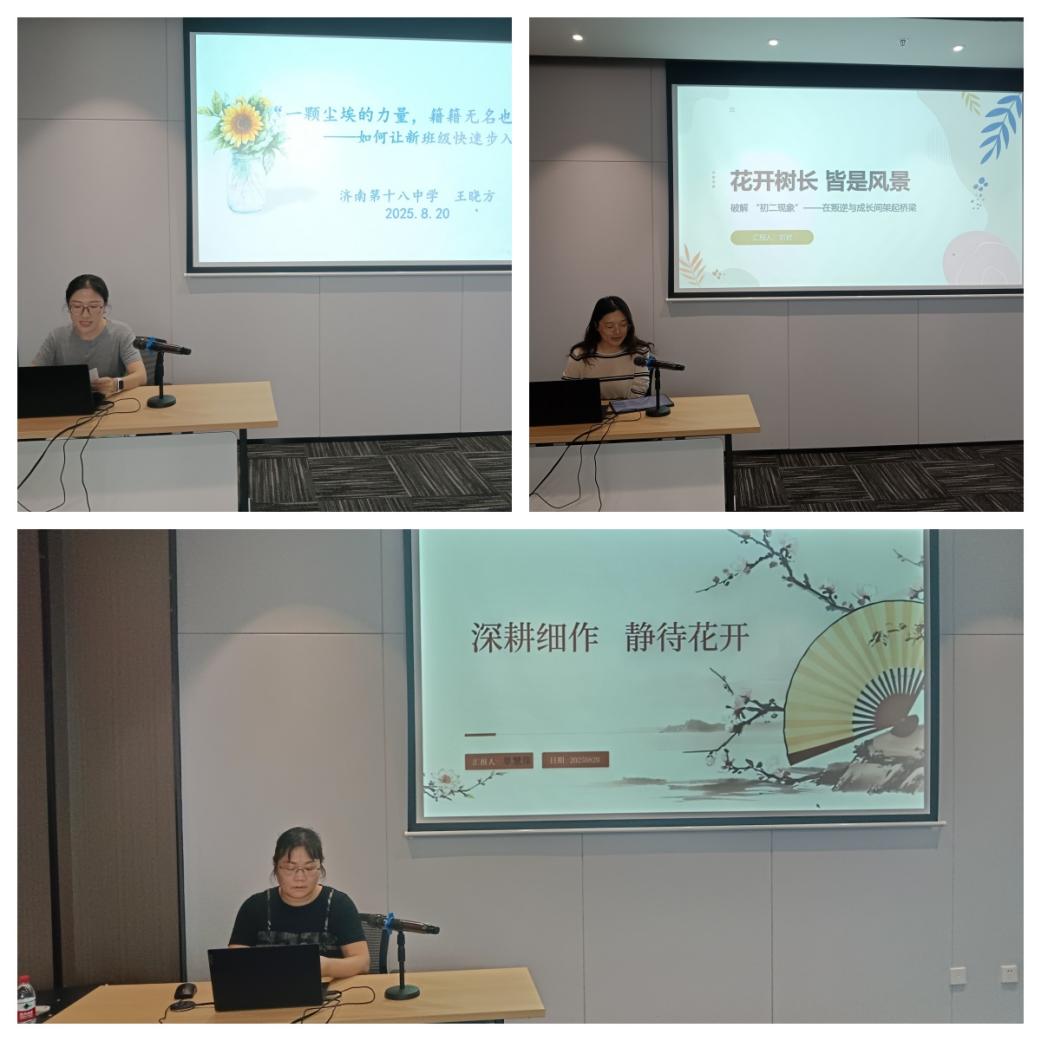 以德铸魂:实践经验分享、育人理念创新与团队精神传承共筑育人根基 教育的温度,藏在每一份细致的班级管理里。8月20日上午,新初一班主任王晓方老师着重阐释了建立班级规则、培养班干部以及组织团队活动的重要性;新初二班主任刘岩老师提出要关注学生逆反心理,协同任课教师共同抓好学习、纪律和卫生等工作;新初三班主任单慧萍老师指出应借助家庭、学校与社会三方合力,实施严格管理,助力学生健康成长。