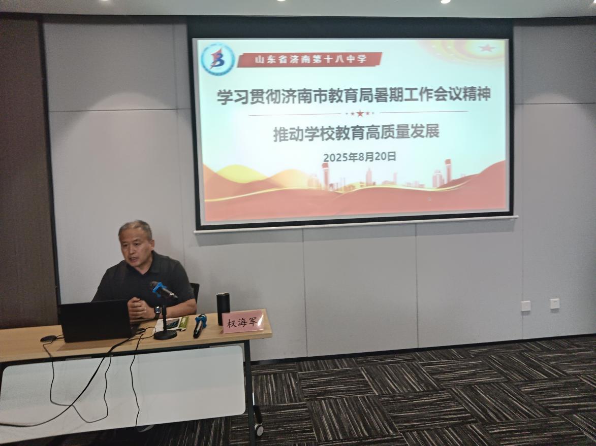 以责领航:党建引领与全局部署共启发展新程 办好教育,党建是引领。8月20日下午,权海军书记首先传达了济南市教育局暑期工作会议精神,将理论学习的 “精神养分” 转化为推动工作的 “实践动能”,要以党建品牌创建为抓手,让党员教师在教学改革、师德建设中当先锋、作表率,推动党建工作与教育教学深度融合,为学校发展注入 “红色动力”。  吕福昌校长就学校整体工作做了具体部署,为会议画上了务实而有力的句号。吕校长提出 “三句嘱托”:一要正视现实,既要看见成绩的光芒,更要清醒认知发展中的短板,不骄不馁,脚踏实地;二要统一思想,将共识熔铸成前行的灯塔,心往一处想,劲往一处使,让育人初心成为共同的航向;三要整装出发,以全新的姿态奔赴新程,共绘学校更璀璨的明天!话语间的担当与期许,让在场每一个人都感受到了沉甸甸的责任,更激发了奋进的豪情。