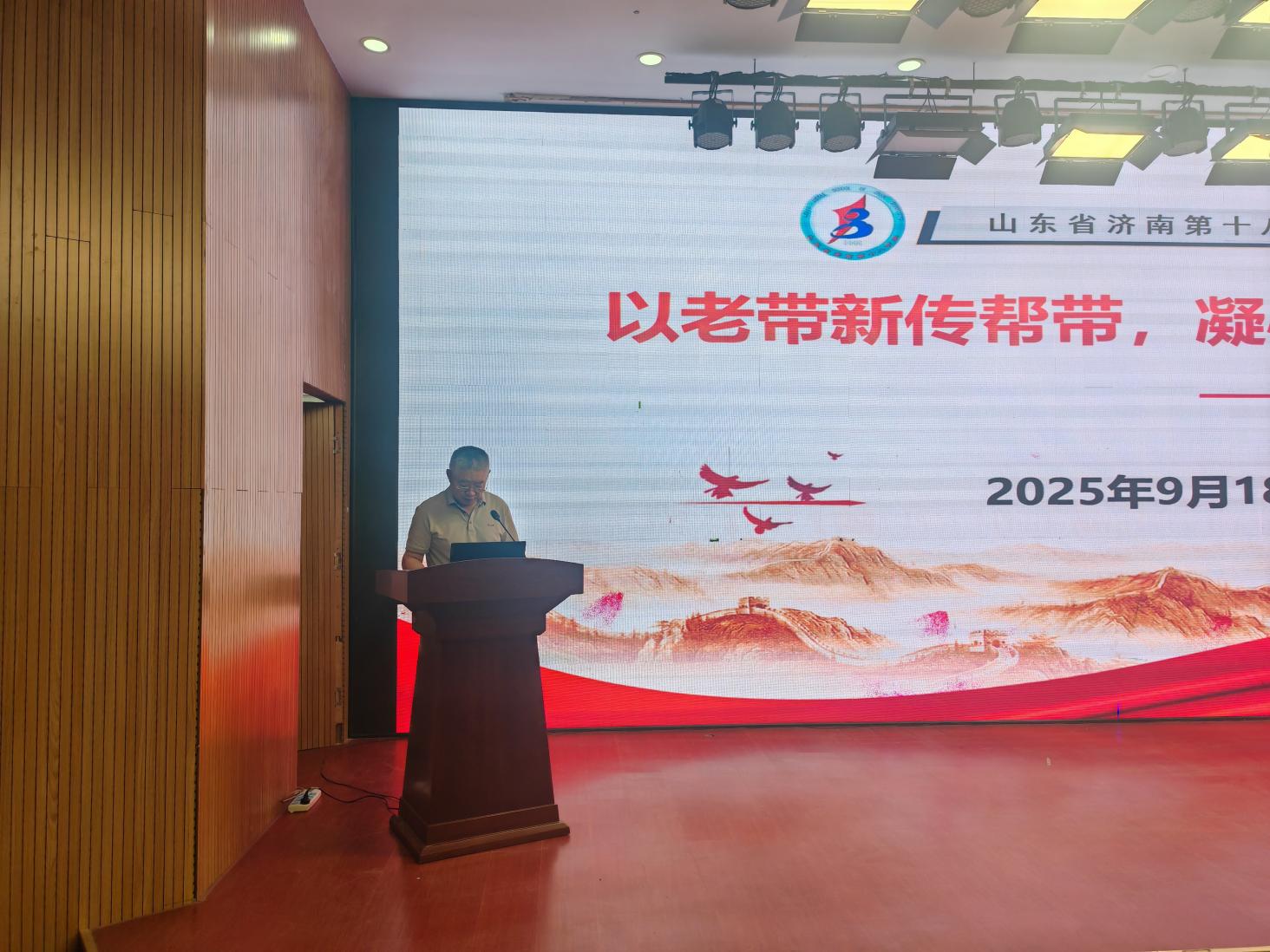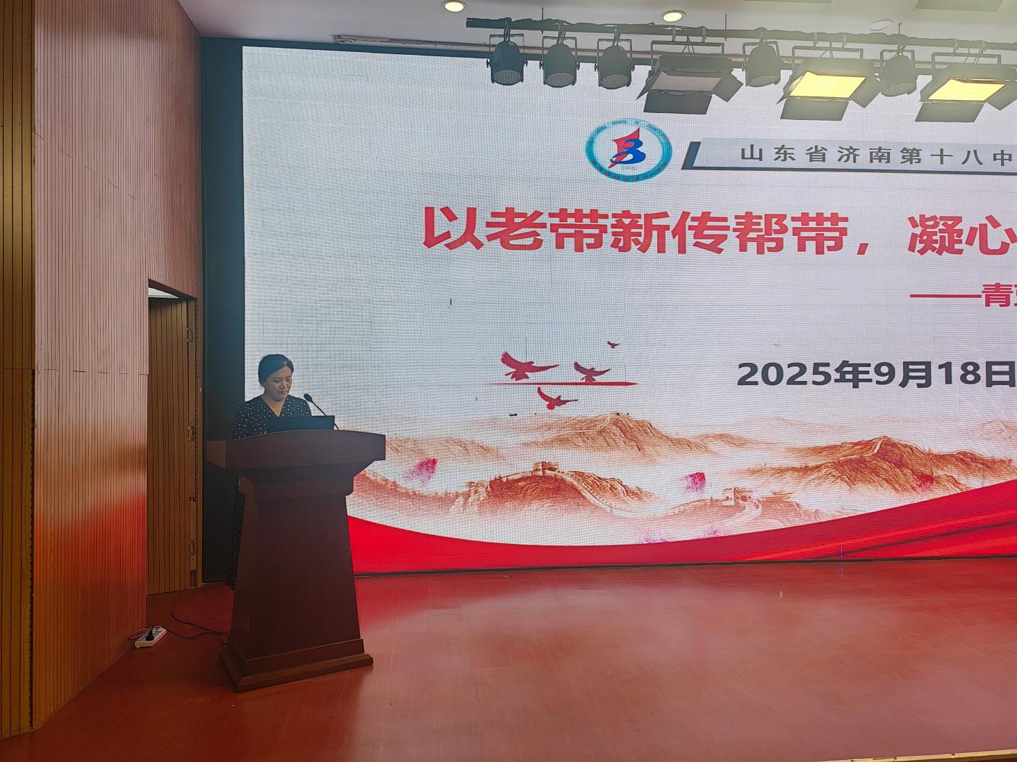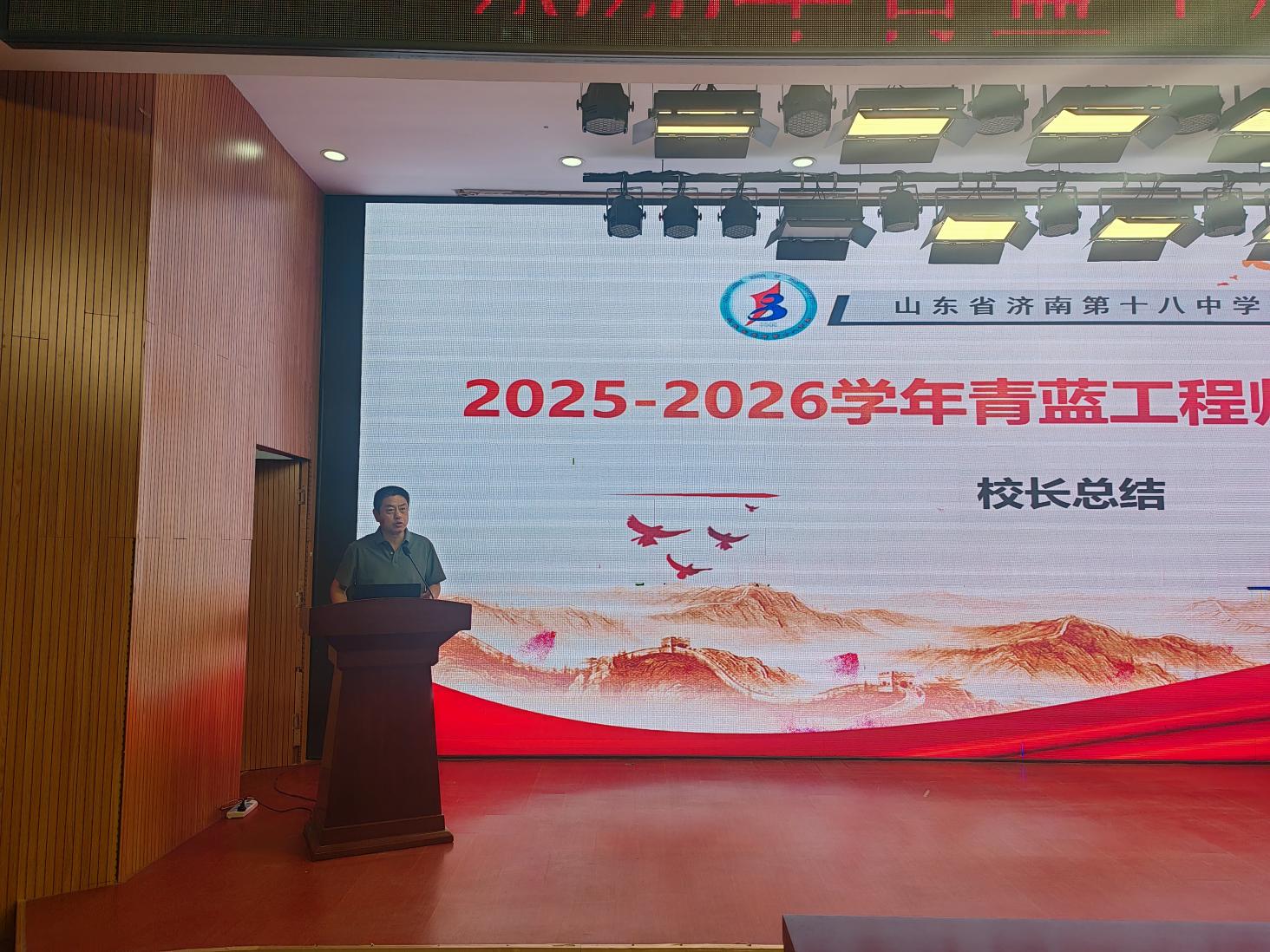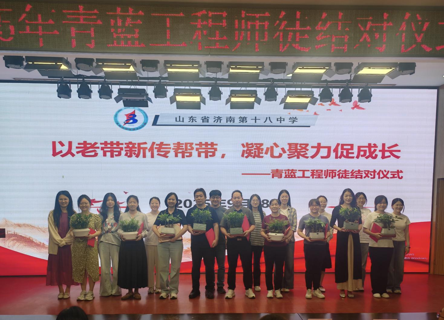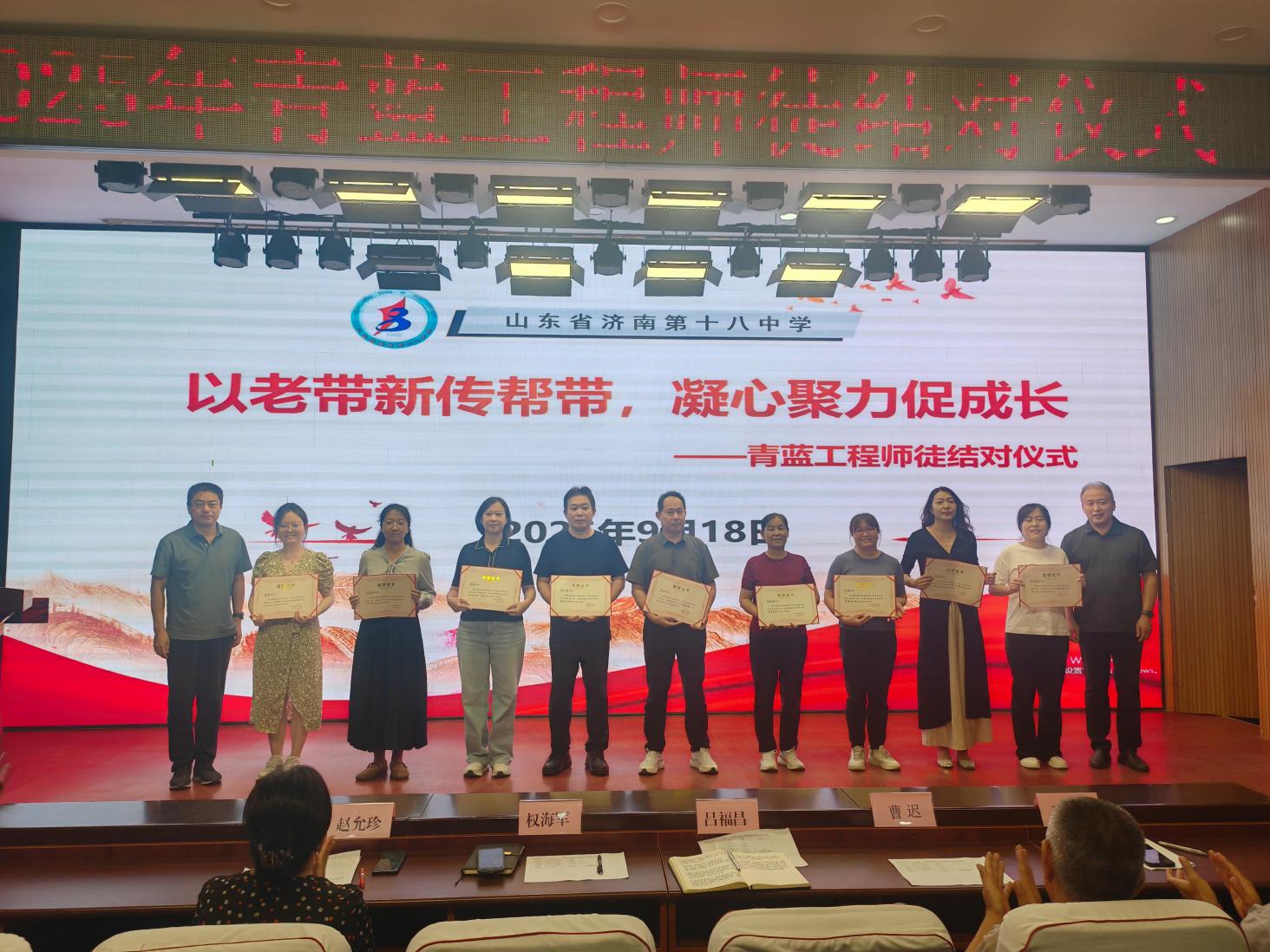 青蓝相映传薪火 师徒携手育桃李 ——济南十八中隆重举行“青蓝工程”师徒结对仪式 为加强教师队伍建设,充分发挥骨干教师的“传、帮、带”作用,助力青年教师快速成长,2025年9月18日下午,济南十八中在报告厅隆重举行了主题为“以老带新传帮带,凝心聚力促成长”的“青蓝工程”师徒结对仪式。