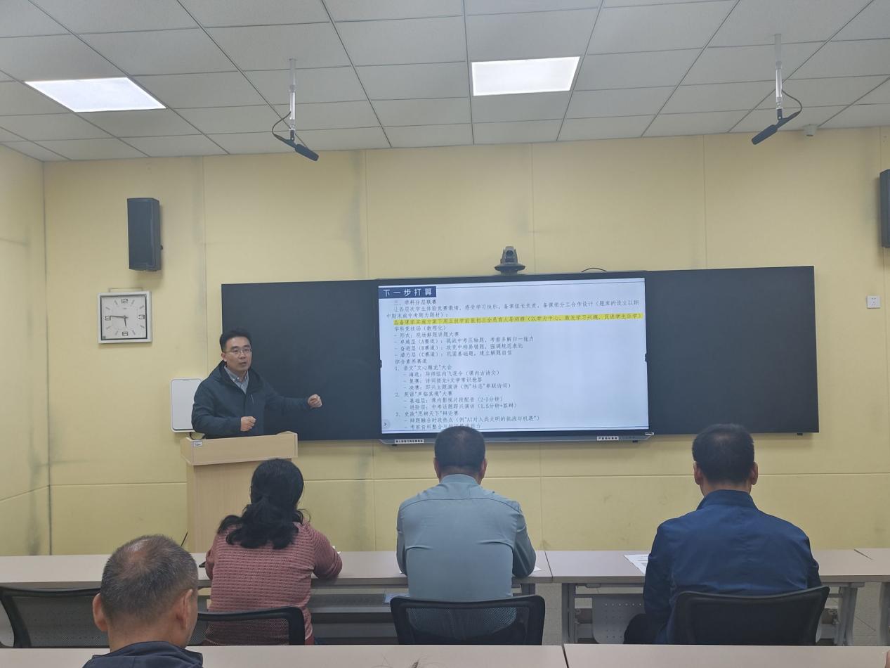 随后,级部主任曲泽朴在发言中重点解读了初三级部"以学为中心"的三大实践路径: 一是深化“全员育人导师制”,让教育更有温度。 让每一位教师成为学生的成长导师,关注学生的思想、心理、学业与生活动态,通过个性化的沟通与指导,让教育关怀渗透到每个细节。“让每一个学生都能感受到学校的教育温度”,为冲刺阶段的初三学生提供坚实的情感支持和精神动力。 二是精准实施“分层教学”,让成长各得其所。 尊重学生个体差异,通过科学的分层教学策略,为不同学力基础的学生设定最适合的学习路径和挑战目标,“让每一个学生都能够在自身原有水平上得到成长”,实现教学效益的最大化。 三是丰富“各学科趣味竞赛活动”,让学习兴趣盎然。 以学科竞赛为载体,激发学生的求知欲和探索精神,“以学为中心,促进学生乐学”,将课堂知识延伸至更广阔的应用空间,让不同层次的学生都能够体验到努力后成功的喜悦,营造你追我赶、积极向上的浓厚学习氛围。