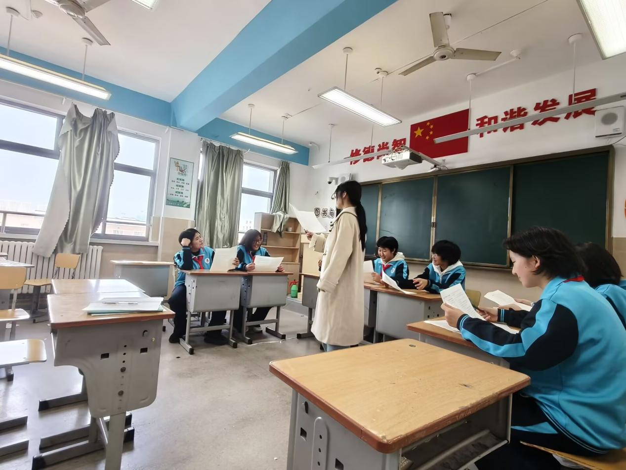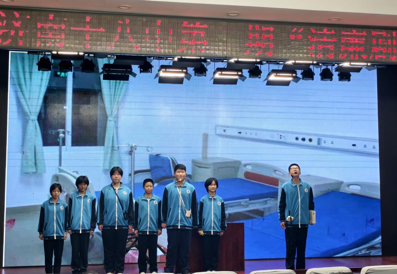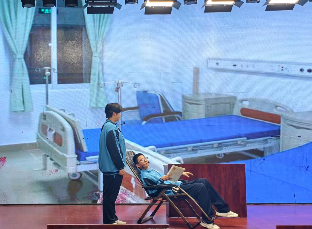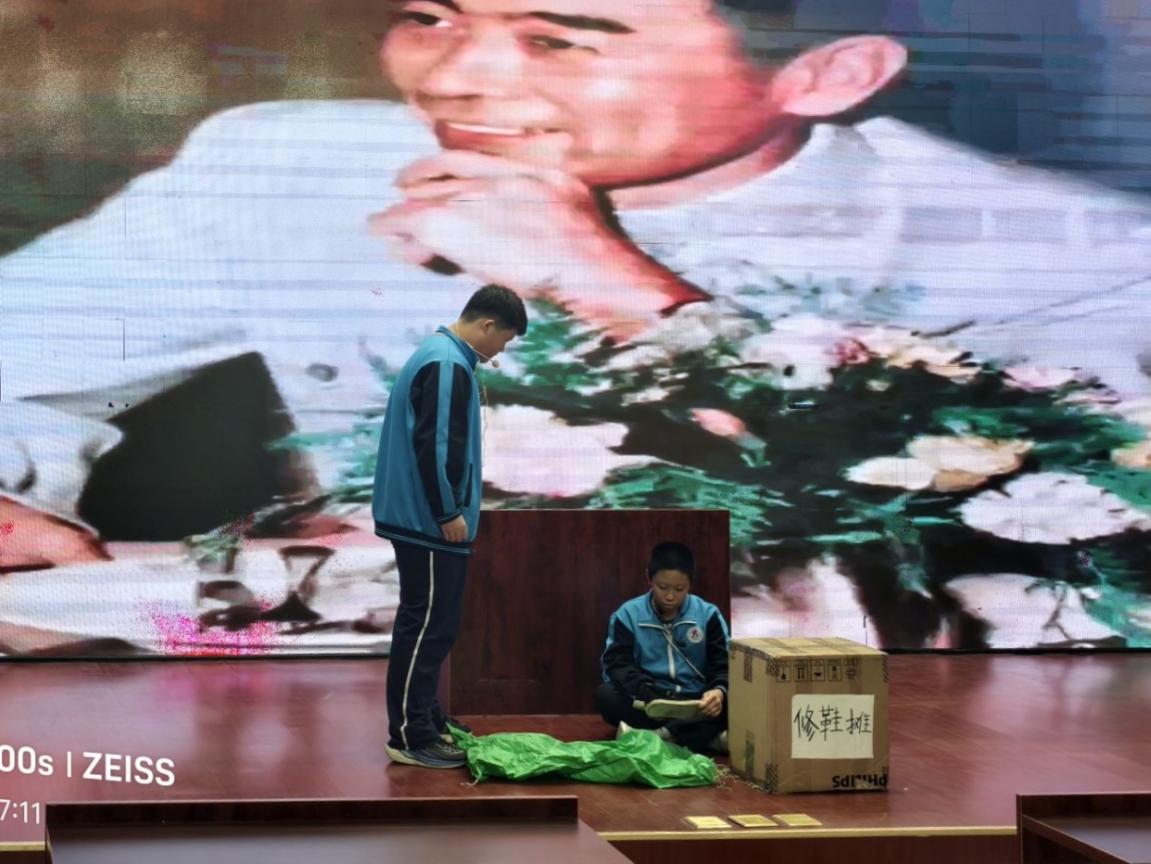 幕后花絮:精心筹备见实效 饰演周恩来总理的同学在幕后分享道:“这段台词我反复练习了几十遍。每一次排练,都仿佛在与历史对话,对周总理清正风范的敬仰也愈发深沉。”为了在舞台上精准传递人物的精神内核,师生们主动利用午休、放学后的时间,反复推敲每一处语调起伏与肢体表达,力求形神兼备。 道具组的同学们秉持“朴素中见真章”的原则,巧妙运用纸板、布料等简易材料,手工制作出贴合剧情的历史场景。各学科组的指导老师们更是全力投入技术支持,他们精心选取历史影像资料,反复调整背景字幕的清晰度与切换节奏,为演出提供了坚实保障。