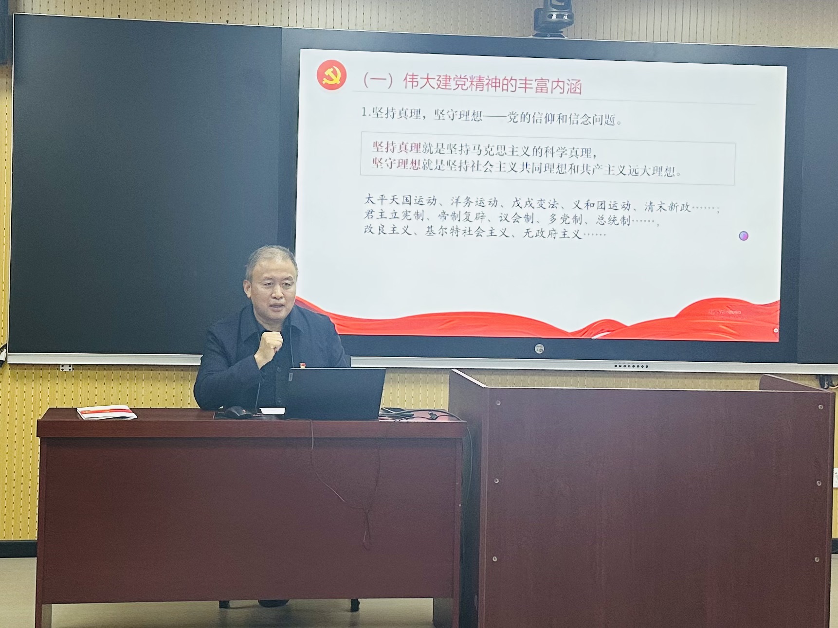 深入解读建党精神的时代内涵 权海军书记围绕“坚持真理、坚守理想,践行初心、担当使命,不怕牺牲、英勇斗争,对党忠诚、不负人民”32字伟大建党精神,结合历史与现实案例展开系统阐述。引用毛泽东同志“为人民谋幸福”的论述与习近平总书记“江山就是人民”的执政理念,强调教育工作者应扎根群众、服务社会,坚守初心如磐的使命担当;通过抗美援朝“冰雕连”的坚韧意志与成昆铁路建设者在“修路禁区”中不畏艰险、甘于牺牲的壮举,展现了中国共产党人不怕牺牲、英勇斗争的鲜明品格;结合不同历史时期入党誓词的演变,明晰了对党忠诚与不负人民的内在统一性,并以脱贫攻坚、西部援建等实践案例,彰显了党始终践行人民立场、推动共同富裕的坚定决心。 同时,权书记还提出弘扬伟大建党精神的具体路径:坚定信仰信念、践行党的宗旨、发扬斗争精神、推进自我革命,并引用梁启超“一国之能立于世界,必有其国民独具之精神”的论述,强调精神传承的重要性。